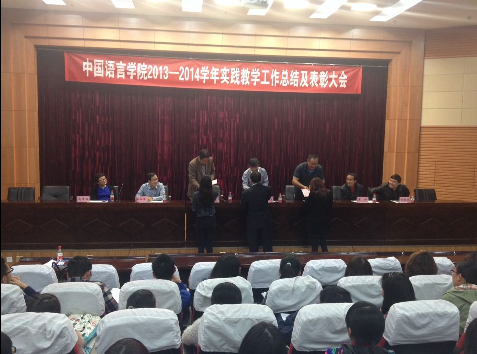 10月26日下午5:00,中国语言学院在校礼堂学术报告厅召开了2013-2014学年实践教学工作总结及表彰会议。教务处处长綦群高、院党总支副书记曹忠军、副院长安占峰及中语系、教学办、学工办主要领导、各专业班班主任出席了会议,中语学院全体专业班学生参加了会议。会议由中语学院院长杨文革主持。