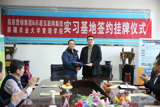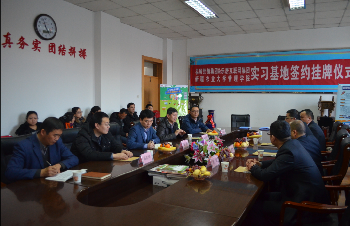 12月26日,管理学院与易居营销集团&乐居互联网集团实习基地签约挂牌仪式在管理学院会议室举行。教务处处长綦群高、校团委副书记高志涛、学院党总支书记谭刚、副院长王承武、不动产系主任李松、国土资源系主任邵战林及学院专业课教师、辅导员,新疆易居董事长李明军、新疆易居总经理吴永、新疆易居执行总经理李军、新疆易居副总经理姚朗、新疆易居策划中心总监鲁译锴等参加签约仪式。