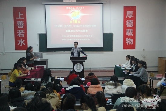 这是我校首次组织参加“ ‘外研社杯’全国大学生英语辩论赛”。校级选拔赛共有70余名学生报名参赛,12月初组织了校园选拔赛初赛,并对进入选拔赛的同学进行了专项辅导。12月26日下午在7102教室组织了“第十八届‘外研社杯’全国大学生英语辩论赛新疆农业大学选拔赛”,外国语学院英语系主任陈玲副教授、英语专业博士赵雯老师、团委书记岳瑞出席了比赛并担任评委,大赛主持人由周川老师担任。