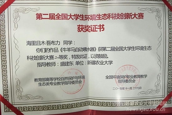 11月27日,第二届全国大学生环境生态科技创新大赛决赛在南京师范大学仙林校区闭幕。新疆农业大学草环学院代表队海里且木·吾布力同学的作品《牛、羊、马自动环保喂水器》获第二届全国大学生环境生态科技创新大赛二等奖。此外,新疆农业大学草环学院代表在第二届全国大学生环境生态科技知识竞答中获三等奖。