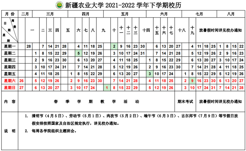 新疆农业大学2021-2022学年第二学期校历及上课时间节次表.docx