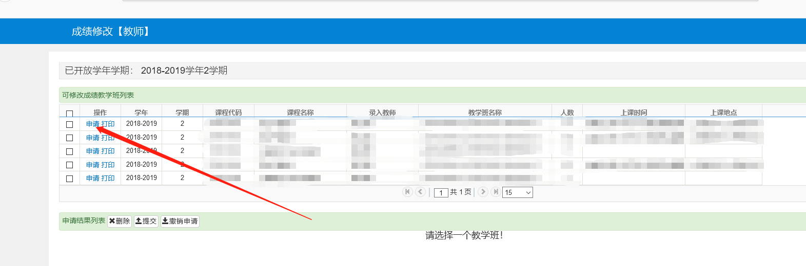 菜单:成绩-->成绩修改【教师】(管理端需提前设置时间)对应学年学期,如下,选择相应教学班,点击右上角【申请】