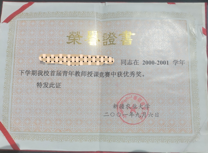 来源于:《关于对首届青年教师授课竞赛优秀奖获得者的表彰决定》(新农大字[2001]98号,2001年9月4日);证书日期:2001年9月6日